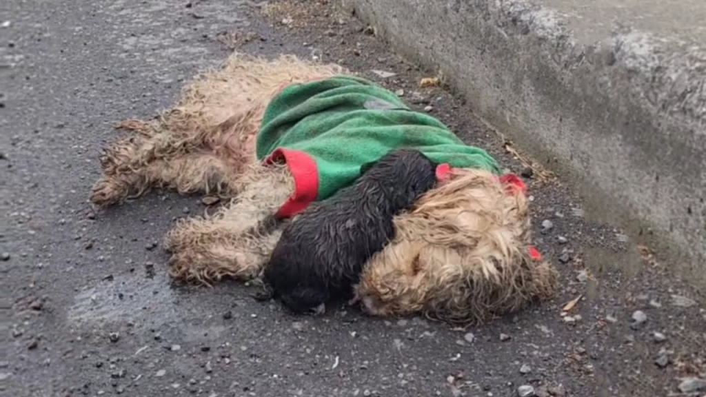 Nestled beside the guardrail, almost invisible against the dust-covered ground, lay a mother dog who had reached the end of her strength. Her fur was tangled, her body cold and still, and her breathing faint. To anyone passing by at high speed, she might have looked like just another shadow on the roadside. But she wasn’t alone. Pressed tightly against her side was a tiny newborn puppy—small enough to fit in a single hand—clinging to her for warmth and comfort.