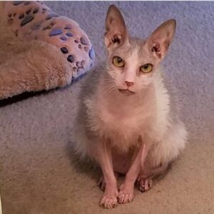 With her gray fur, some bald spots, and a tail that resembles a rat’s, Possum often gets strange looks and even some mean comments. But don’t be fooled by her looks; Possum has a heart full of love and a personality that sparkles like a diamond.To begin, her journey to find a loving home was really special. She was born in a wild litter in central North Carolina, and she was definitely the odd one out. While her siblings were all short-haired calicos, Possum’s unique look made her stand out. Some experts think she might have gotten some rare genes from a werewolf cat, called Lykoi, or something similar. No matter the reason, her unusual looks shaped her fate. Even with her different appearance, Possum was a sweet and loving kitten. She wanted affection and attention just like any other cat. Sadly, her looks made it hard for her to find a forever home. Many people were unsure about adopting a cat that looked so unusual. Some even worried she might be sick or have been mistreated.
