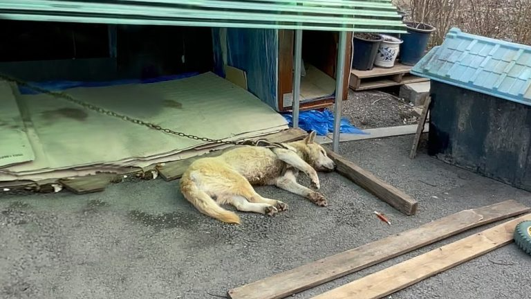 While the medical team worked tirelessly to stabilize him, the rescuers received a phone call that would reveal the rest of his tragic past. It was from his previous owner. In a calm but indifferent tone, the man confessed that the dog had been kept as a guard dog for fourteen long years at an abandoned factory. Isolated and tied up, his only job had been to protect a place no one visited anymore. For years, he lived without companionship or affection — only chains and silence. In his final days, the dog had stopped eating and drinking altogether. Believing that he was near death, the owner had simply dragged him outside and left him there to die in the cold.
